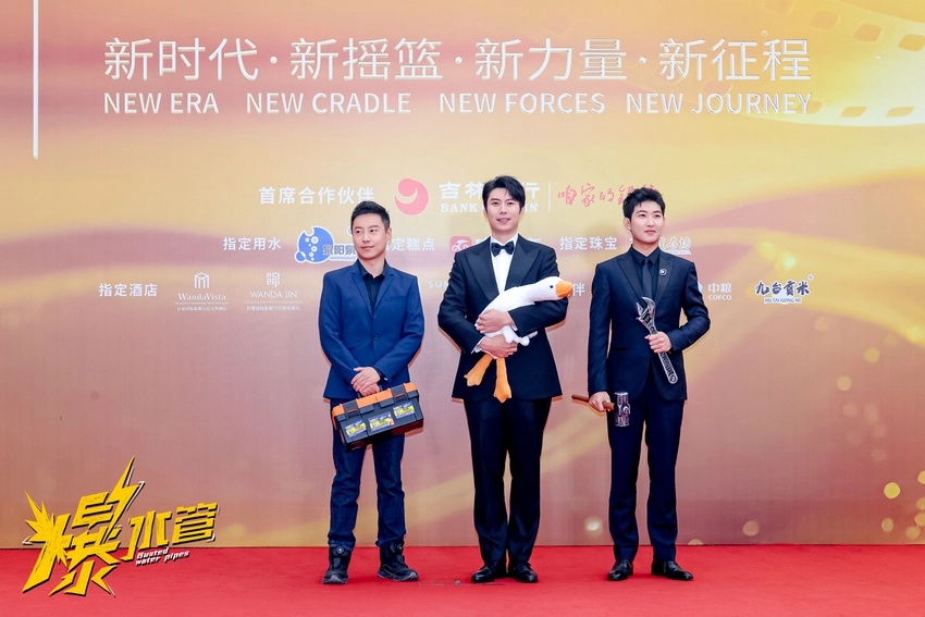 昨日,由导演周涤啡执导的犯罪喜剧电影《爆水管》亮相第二十届中国长春电影节,导演周涤啡和领衔主演艾伦、闫佩伦代表剧组出席闭幕式。影片中,一伙老实人警察和一群祖传盗墓贼,因“爆水管”而阴差阳错相遇,共同卷入了一起古墓宝藏案。艾伦和闫佩伦作为影片中盗墓小队的“显眼包”代表,此次在红毯上也整活不断。艾伦怀抱一只“大鹅宝宝”,闫佩伦则带着修水管工具,一手锤子一手扳子,画面十分有趣。红毯上,艾伦分享手中的“好大鹅”正是在片中和自己相依为命的爱宠。不仅如此,导演周涤啡的手中还提着一个贴有“DMJZ修水管世家”小广告的工具箱,这波来自“地下土木工程领域专业团队”的小节目不仅为观众们带来了十足欢乐,也让人对《爆水管》的荒诞喜剧故事十分好奇。