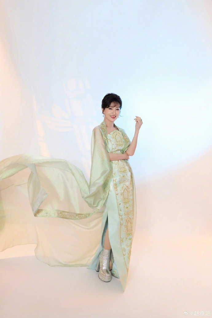这组十宫格写真里,她身着淡青绿色改良中式长裙,裙身绣满精致的鎏金纹样,同色系薄纱披风随风轻扬,既有旗袍的端庄雅致,又藏着几分仙气飘飘。镜头里的她,或温柔浅笑,或轻抬手腕,腰背挺拔、步态从容,每一个姿态都写满了岁月沉淀的优雅。
