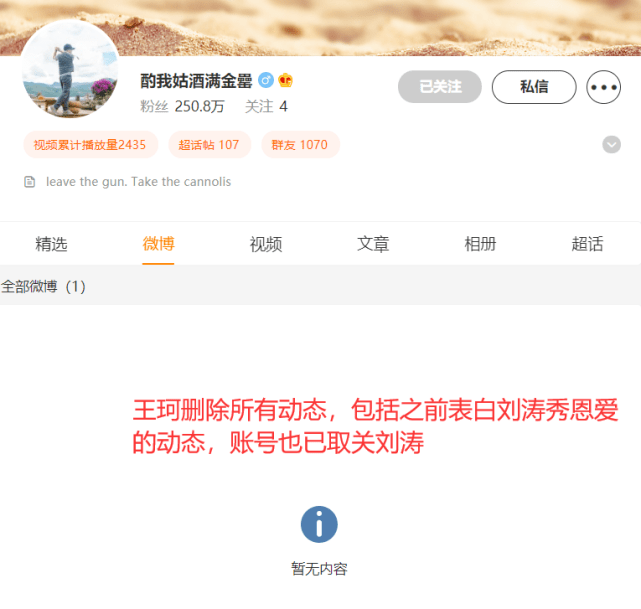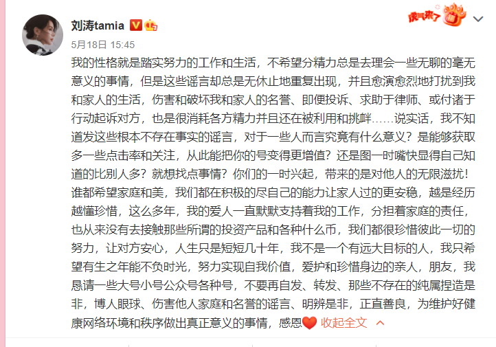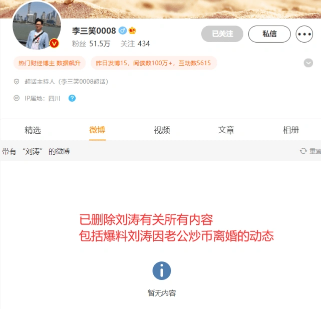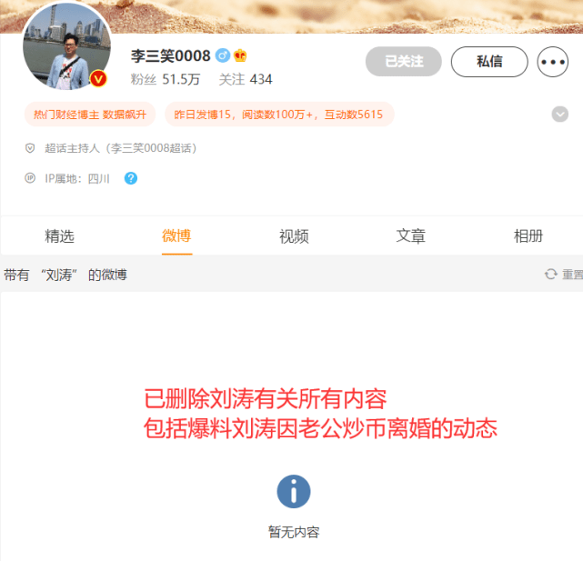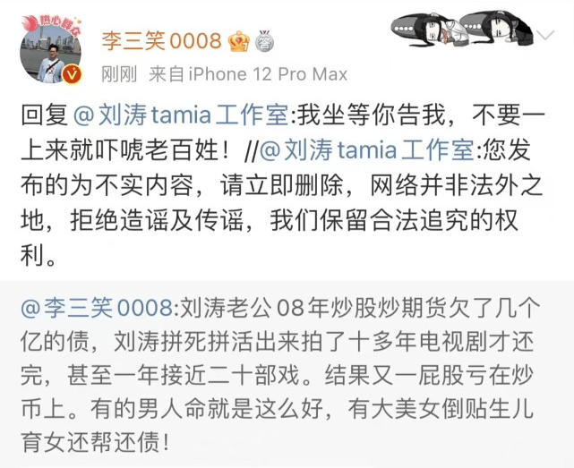 爆料刘涛离婚博主叫板后删文 王珂取关刘涛清空动态 全文约108字, 阅读需要1分钟 昨日有博主爆料刘涛离婚,在工作室否认之后,刘涛也发文回应,表示:”我爱的人一直支持我的工作,没有接触过那些所谓的投资产品“。据悉,工作室发文时爆料者曾口气强硬地表示”我坐等你告我“,但在刘涛发文没多久 刘涛 昨日有博主爆料刘涛离婚,在工作室否认之后,刘涛也发文回应,表示:”我爱的人一直支持我的工作,没有接触过那些所谓的投资产品“。据悉,工作室发文时爆料者曾口气强硬地表示”我坐等你告我“,但在刘涛发文没多久之后,就选择了删文,还有人发现王珂取关了刘涛。 相关人物