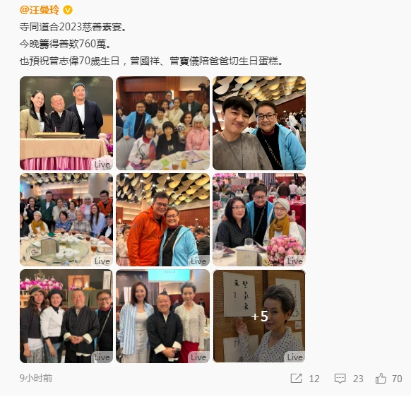 曾宝仪曾国祥为曾志伟庆祝70岁生日 黄日华叶童等欢聚一堂 全文约93字, 阅读需要1分钟 恰逢曾志伟70岁生日,女儿曾宝仪和儿子曾国祥一起亮相为老爸庆生。 4月14日,资深传媒人汪曼玲在微博分享了一组与一众香港艺人们参加某慈善素宴的现场照,包括曾志伟、苗侨伟戚美珍夫妇、黄日华、叶童等众多老牌港星们现身。恰逢曾志伟70岁生日,女儿曾宝仪和儿子曾国祥一起亮相为老爸庆生。 相关人物