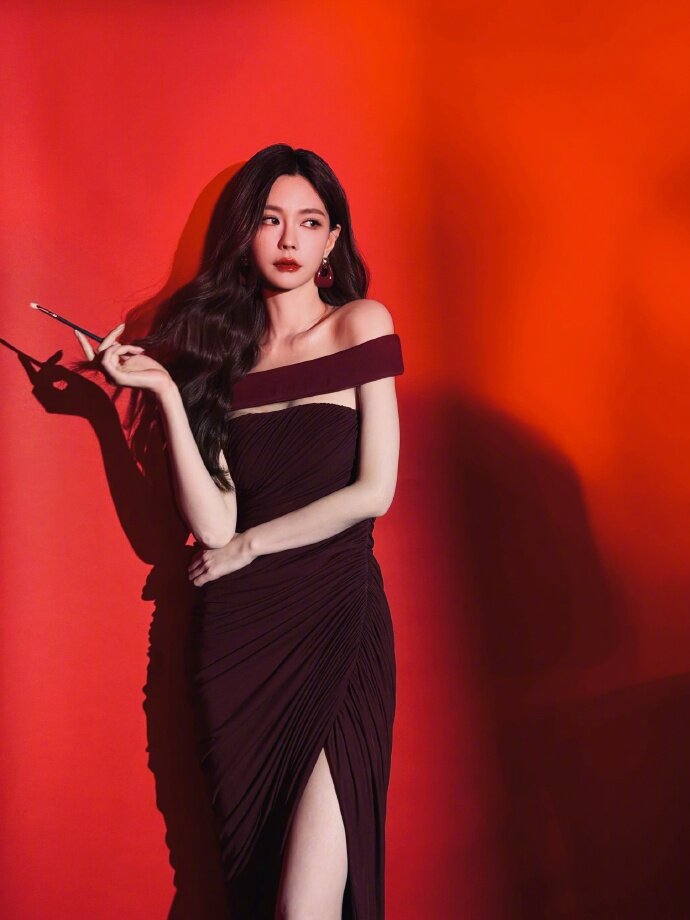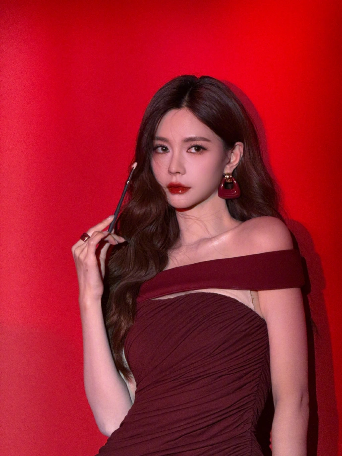 暗调酒红裙裹着流畅的肩颈线条,一字肩露出的肌肤浸在红绒背景的柔光里,手持长杆的姿态带着漫不经心的慵懒,抬眼时的眼神又裹着恰到好处的锐度。