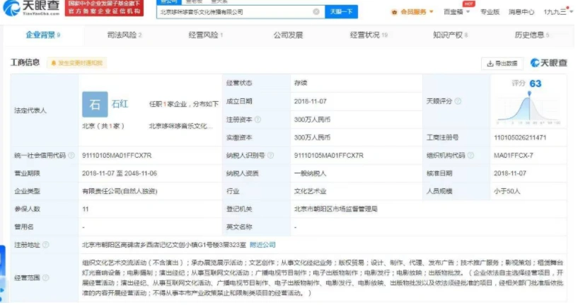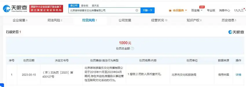 久之网讯 近日,天眼查App显示,北京哆咪哆音乐文化传播有限公司因在2018年11月至2023年04月期间,存在未经批准擅自从事经营性互联网文化活动的行为,被北京市文化和旅游局警告并罚款1000元。...