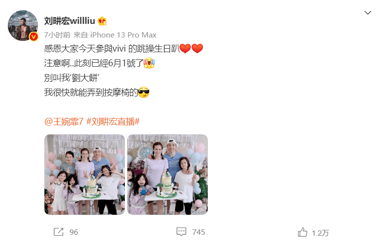 刘畊宏为妻子王婉霏庆生 一家六口比耶合照好幸福 全文约61字, 阅读需要1分钟 6月1日凌晨,刘畊宏在社交平台晒出为妻子王婉霏庆生的现场合照,并写道“感恩大家今天参与vivi 的跳操生日趴”。照片中刘畊宏全家人开心比耶,幸福有爱。 6月1日凌晨,刘畊宏在社交平台晒出为妻子王婉霏庆生的现场合照,并写道“感恩大家今天参与vivi 的跳操生日趴”。照片中刘畊宏全家人开心比耶,幸福有爱。 相关人物