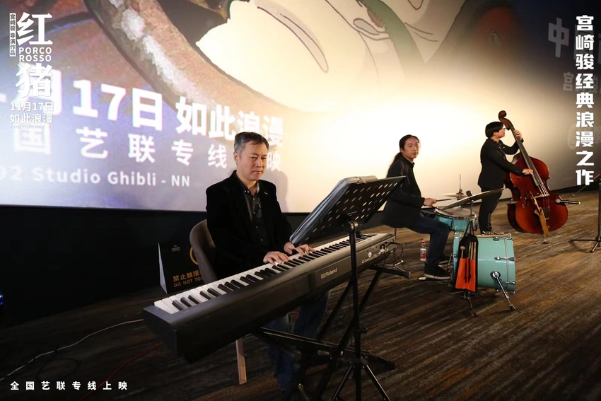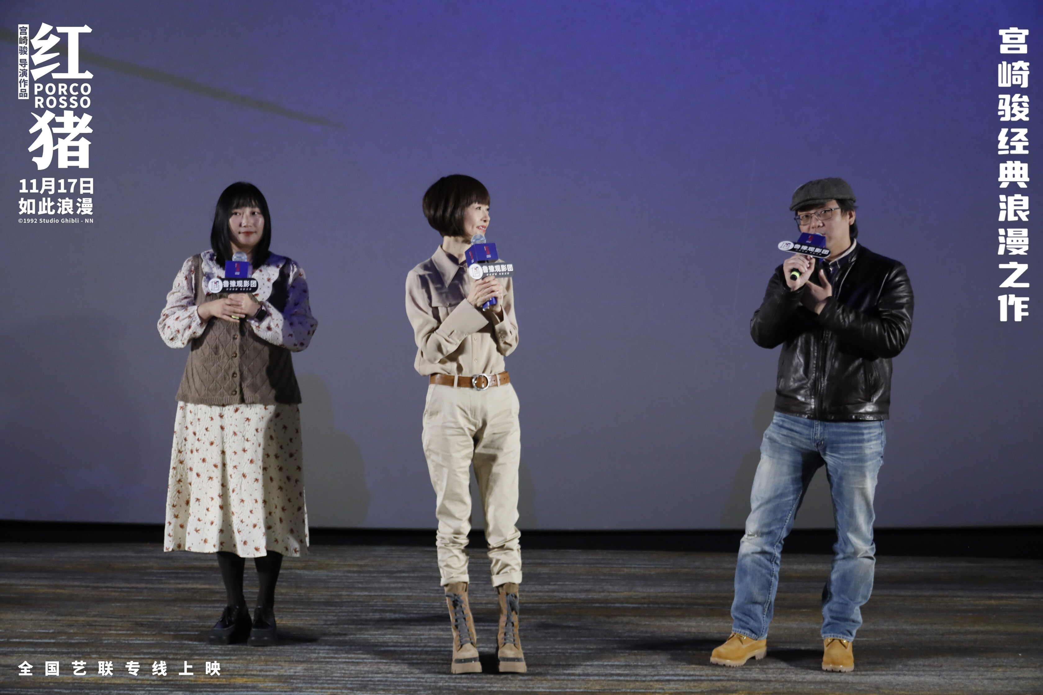 此次首映礼的互动环节亮点不断。电影开场前,音乐大师久石让倾力打造的电影插曲被台上的爵士乐队深情演绎,可谓是一曲浪漫的前奏,将观众引入故事中。电影缓缓落幕后,在悠长的乐曲声中,从观众席中传来电影中的中文版经典台词,在一道道追光的指引下,电影《红猪》中文版配音导演皇贞季、配音演员山新等人惊喜亮相,一句句电影中关于爱、命运与信仰的台词经过著名配音演员之口,更加触及心灵。皇贞季、山新等在现场也分享了观影感受“电影中的菲儿就是‘直球少女’,天真烂漫”、“喜欢冒险、喜欢在蓝天中翱翔,就一定会喜欢《红猪》”。