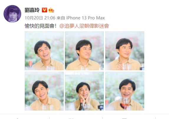 刘嘉玲晒梁朝伟见面会萌照 双手托腮甜笑表情可爱 全文约42字, 阅读需要1分钟 久之娱乐讯 20日刘嘉玲在社交平台晒出一组梁朝伟见面会的萌照。照片里的梁朝伟笑容可爱,托腮甜笑。 久之娱乐讯 20日刘嘉玲在社交平台晒出一组梁朝伟见面会的萌照。照片里的梁朝伟笑容可爱,托腮甜笑。 相关人物