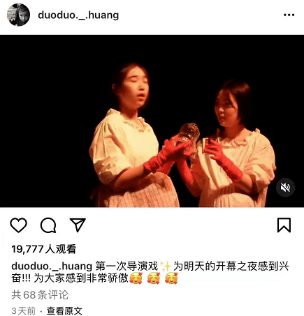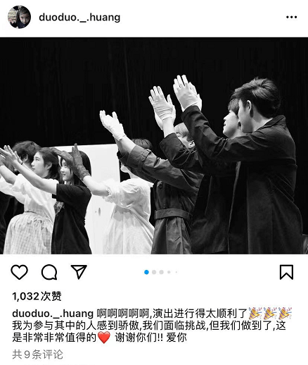 黄多多发文庆演出顺利 穿黑色T恤戴大圆形耳环显干练 全文约125字, 阅读需要1分钟 合照中,黄多多身穿黑色T恤出镜,还戴着一对大圆形的耳饰。据悉,这场戏的导演正是多多自己。 4月1日,黄磊大女儿黄多多在个人社交账号发文报喜,她晒出同学们表演的照片并发文写道:“演出进行得太顺利了,我为参与其中的每一个人感到骄傲,我们面临挑战,但我们做到了,这是非常值得的,谢谢你们,爱你们”。合照中,黄多多身穿黑色T恤出镜,还戴着一对大圆形的耳饰。据悉,这场戏的导演正是多多自己。 相关人物