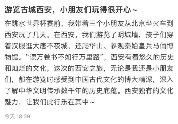 郭晶晶带三个孩子游西安 哥哥搂着妹妹画面温馨有爱 全文约72字, 阅读需要1分钟 4月23日,郭晶晶晒出带着三个孩子游玩古城西安的照片,孩子们穿着汉服逛大唐不夜城,爬华山,参观兵马俑等。照片中,妹妹展露侧颜,五官精致像妈妈,哥哥搂着妹妹画面十分有爱。 4月23日,郭晶晶晒出带着三个孩子游玩古城西安的照片,孩子们穿着汉服逛大唐不夜城,爬华山,参观兵马俑等。照片中,妹妹展露侧颜,五官精致像妈妈,哥哥搂着妹妹画面十分有爱。 相关人物
