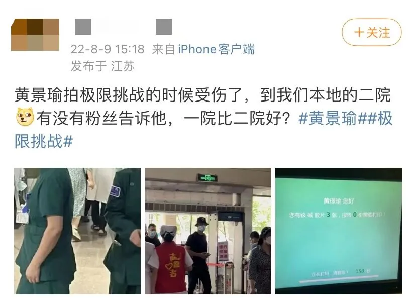 黄景瑜现身医院被偶遇 疑似因拍摄综艺引身体不适 全文约101字, 阅读需要1分钟 9日,有网友偶遇现身淮安医院。照片中,黄景瑜一身黑色穿搭。头戴鸭舌帽十分低调,网友还晒出疑似黄景瑜的核磁报告单,但有粉丝解释称“因中暑才去医院”。随后,有媒体求证到,黄景瑜去医院是因为颈椎病复发。 9日,有网友偶遇现身淮安医院。还配文称:“拍摄《极限挑战》的时候受伤了”。照片中,黄景瑜一身黑色穿搭。头戴鸭舌帽十分低调,网友还晒出疑似黄景瑜的核磁报告单,但有粉丝解释称“因中暑才去医院”。随后,有媒体求证到,黄景瑜去医院是因为颈椎病复发。 相关人物