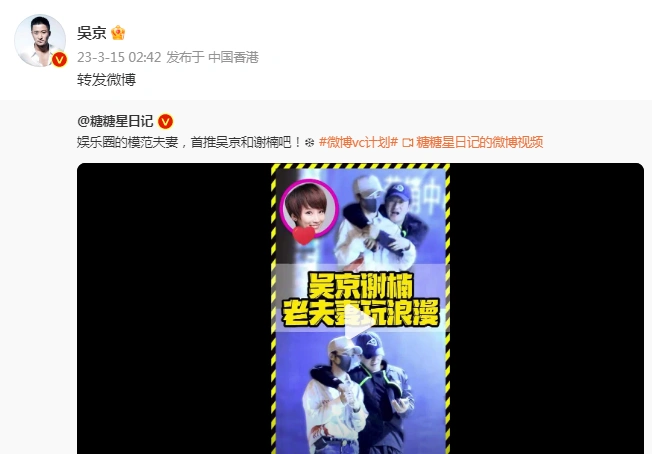 吴京转发视频超甜秀恩爱 标题写着结婚八年仍如胶似漆 全文约40字, 阅读需要1分钟 3月15日凌晨,吴京转发微博磕起自己与老婆谢楠的CP,视频标题:结婚八年仍如胶似漆,大方高调秀恩爱。 3月15日凌晨,吴京转发微博磕起自己与老婆谢楠的CP,视频标题:结婚八年仍如胶似漆,大方高调秀恩爱。 相关人物
