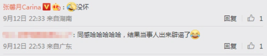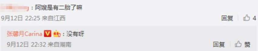 林峯老婆张馨月否认怀二胎 全文约59字, 阅读需要1分钟 12日,张馨月在微博晒出为孩子下厨做美食的视频,身穿一身黑色T恤的她侧面看小腹隆起,不少网友猜测她怀孕,对此,她在评论区回复网友称:“没怀”。 12日,张馨月在微博晒出为孩子下厨做美食的视频,身穿一身黑色T恤的她侧面看小腹隆起,不少网友猜测她怀孕,对此,她在评论区回复网友称:“没怀”。 相关人物