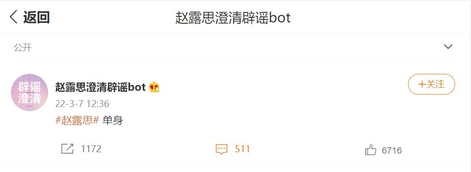 3月7日,“赵露思澄清辟谣bot”发布了一条微博:“单身”,澄清网络上盛传的赵露思恋爱绯闻。据悉,此前,赵露思和某男艺人因戏生情的传闻在网络上传播并引起热议。