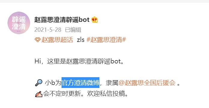 3月7日,“赵露思澄清辟谣bot”发布了一条微博:“单身”,澄清网络上盛传的赵露思恋爱绯闻。据该微博账号发布的介绍博文显示,该账号为官方澄清微博,隶属于赵露思全国后援会。据悉,此前,赵露思和某男艺人因戏生情的传闻在网络上传播并引起热议。