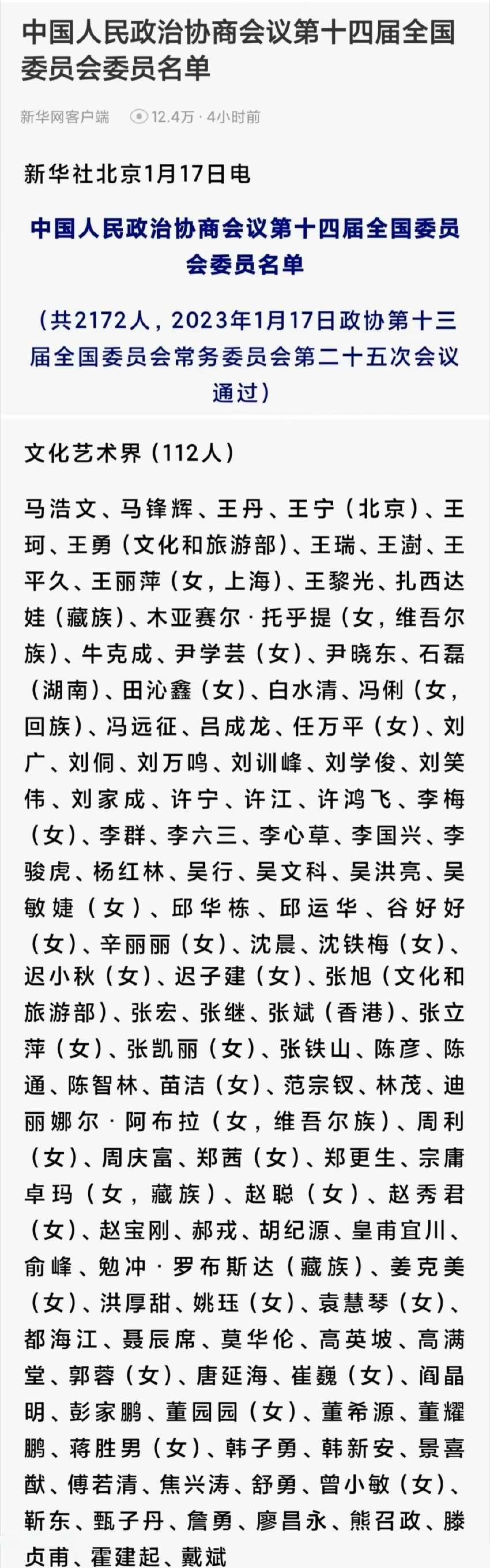 新一届全国政协委员名单公布 靳东甄子丹当选解锁新身份 全文约47字, 阅读需要1分钟 1月18日,据新华网客户端,《中国人民政治协商会议第十四届全国委员会委员名单》公布,靳东甄子丹当选全国政协委员。 1月18日,据新华网客户端,《中国人民政治协商会议第十四届全国委员会委员名单》公布,靳东甄子丹当选全国政协委员。 相关人物