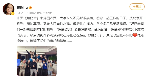 《如懿传》播出七周年主演重聚 周迅董洁童瑶等合照笑容甜 全文约48字, 阅读需要1分钟 2月20日,周迅、霍建华领衔主演的《如懿传》播出七周年,主创演员小范围再聚首,周迅、董洁、童瑶、李纯、张佳宁等合照中笑的甜。 2月20日,周迅、霍建华领衔主演的《如懿传》播出七周年,主创演员小范围再聚首,周迅、董洁、童瑶、李纯、张佳宁等合照中笑的甜。 相关人物