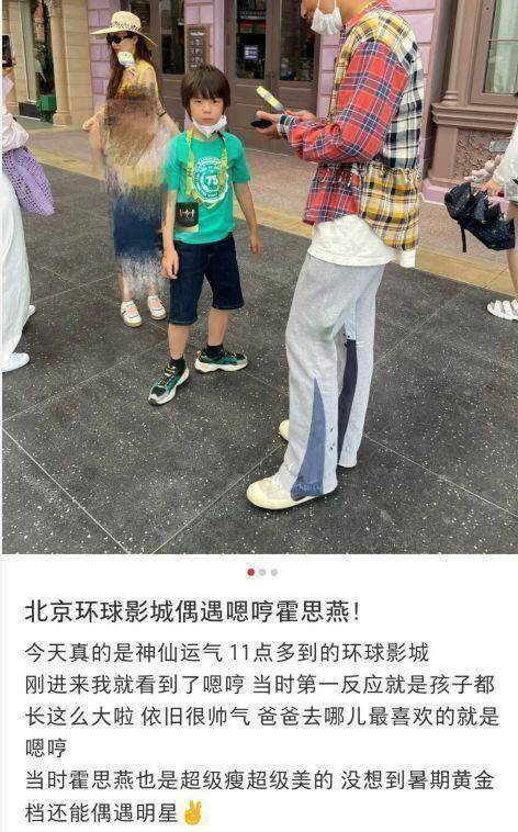 霍思燕一家环球影城游玩被偶遇 嗯哼长高不少愈发帅气 全文约79字, 阅读需要1分钟 19日,有网友在北京环球影城偶遇霍思燕一家。照片中,霍思燕身穿黄色上衣搭配白色短裤,网友称本人又美又瘦,状态非常好。嗯哼长高不少,越来越帅气。妹妹也罕见现身一同游玩,一家人十分温馨。 19日,有网友在北京环球影城偶遇霍思燕一家。照片中,霍思燕身穿黄色上衣搭配白色短裤,网友称本人又美又瘦,状态非常好。嗯哼长高不少,越来越帅气。妹妹也罕见现身一同游玩,一家人十分温馨。 相关人物