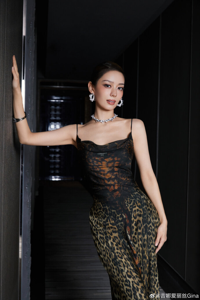 久之娱乐讯 暗调光影里,黑纱吊带先裹住了半分慵懒——豹纹纹理藏在纱质褶皱里,随着吉娜抬臂的动作泛着细碎的光,颈间的项链、耳侧的钻环,是冷调里最恰好的暖。
