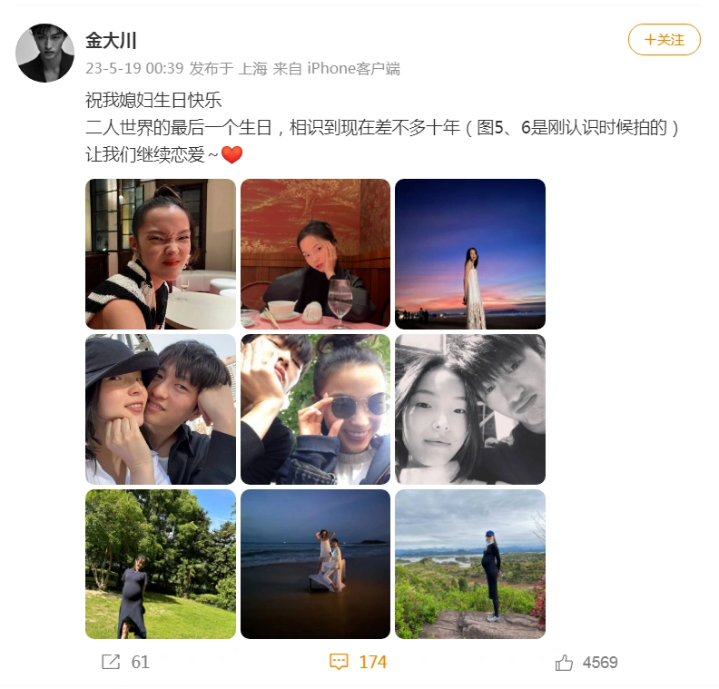 金大川晒照为老婆雎晓雯庆生 称相识十年继续恋爱 全文约123字, 阅读需要1分钟 5月19日凌晨,金大川晒出九宫格照片为妻子雎晓雯送生日祝福,配文“祝我媳妇生日快乐。二人世界的最后一个生日,相识到现在差不多十年(图5、6是刚认识时候拍的)让我们继续恋爱~”配图中有二人... 5月19日凌晨,金大川晒出九宫格照片为妻子雎晓雯送生日祝福,配文“祝我媳妇生日快乐。二人世界的最后一个生日,相识到现在差不多十年(图5、6是刚认识时候拍的)让我们继续恋爱~”配图中有二人甜蜜合照,也有雎晓雯怀孕前后的单人照,雎晓雯评论“一辈子”。很多网友围观幸福送祝福,“太美好啦”、“哥嫂好幸福”。 相关人物