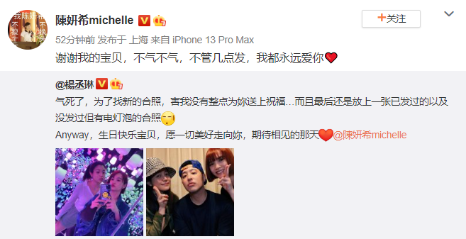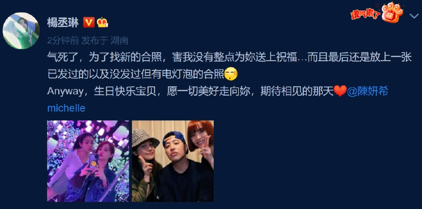 杨丞琳连续九年零点为陈妍希庆生 全文约66字, 阅读需要1分钟 5月31日是陈妍希生日,好友杨丞琳零点晒合照为她庆生,并配文:“气死了,为了找新的合照,害我没有整点为你送上祝福…”陈妍希也开心回复:“不管几点发,我都永远爱你!” 5月31日是陈妍希生日,好友杨丞琳零点晒合照为她庆生,并配文:“气死了,为了找新的合照,害我没有整点为你送上祝福…”陈妍希也开心回复:“不管几点发,我都永远爱你!” 相关人物