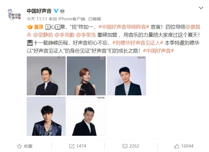 刘德华梁静茹李克勤等加盟《中国好声音》 全文约53字, 阅读需要1分钟 7月13日,2022《中国好声音》导师阵容官宣:廖昌永、梁静茹、李克勤、李荣浩。另外,刘德华也将以“好声音见证人”的身份见证“好声音”们的成长之路。 7月13日,2022《中国好声音》导师阵容官宣:廖昌永、梁静茹、李克勤、李荣浩。另外,刘德华也将以“好声音见证人”的身份见证“好声音”们的成长之路。 相关人物