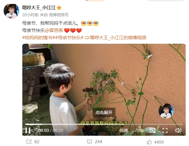 嗯哼母亲节帮霍思燕干活 修理花园可爱又卖力 全文约32字, 阅读需要1分钟 5月12日,嗯哼在个人社交账号更新视频,晒出了一段母亲节帮霍思燕干活的视频。 5月12日,嗯哼在个人社交账号更新视频,晒出了一段母亲节帮霍思燕干活的视频。 相关人物