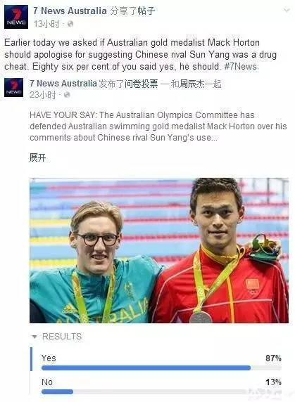 在“孙杨&霍顿”这件事上,现在达到的热度远不止是一句小小的言论那么简单,就连澳大利亚自己的媒体都在脸书上,就“霍顿该不该向孙杨道歉”发起了一条投票,结果,打脸啵?啪啪滴哈~