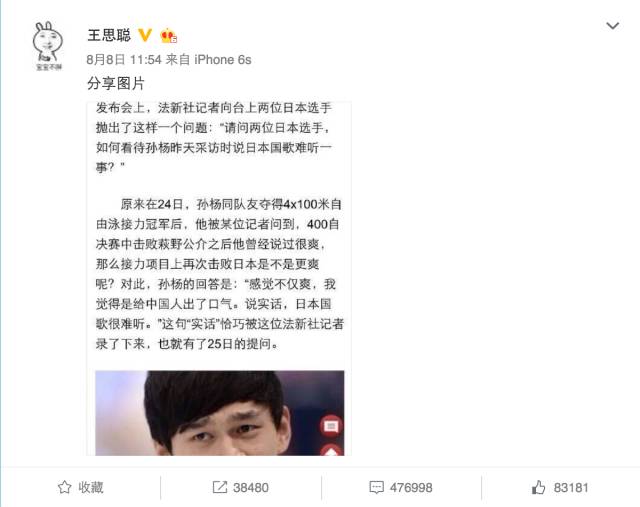 不过值得肯定的是,大家依旧是站在维护国家民族利益的战线,也刷新了闻君对于粉丝们的看法,中国有的不止是脑残粉,大部分的都是理智清醒,能分辨出好坏的。可是啊,王思聪紧接着又发了一条微博,文中大意就是孙杨早前参加比赛的时候也曾出口伤人。