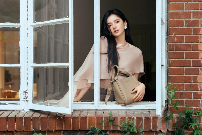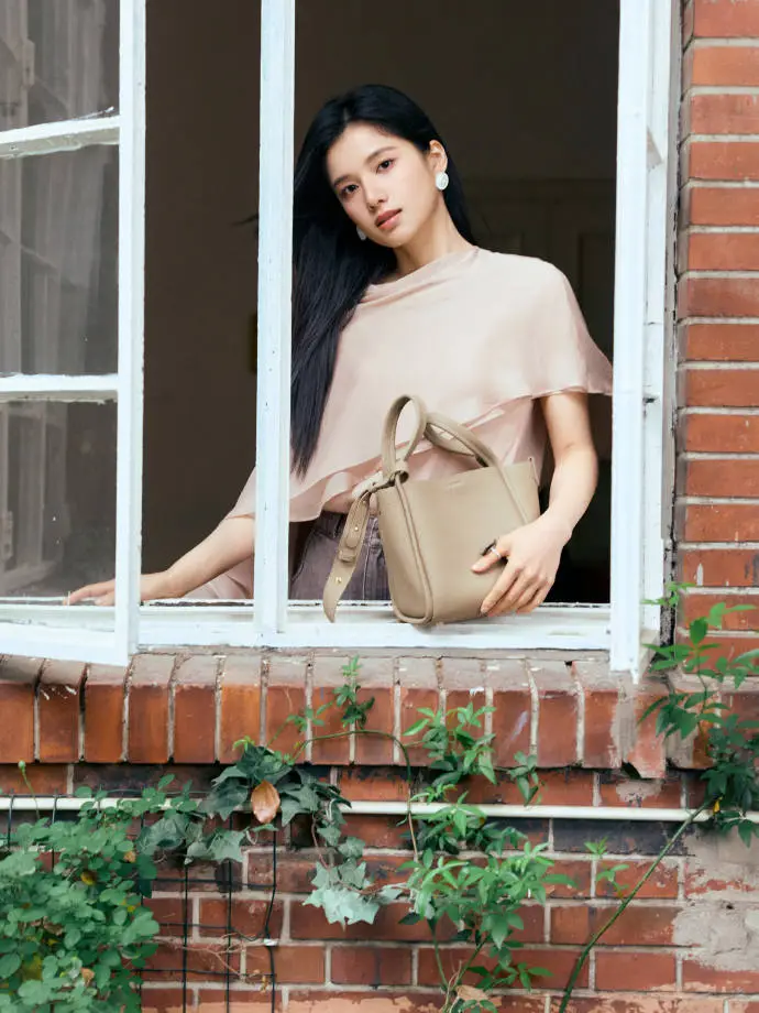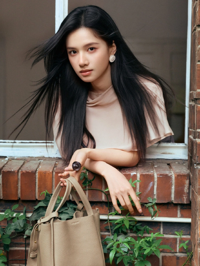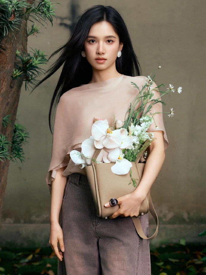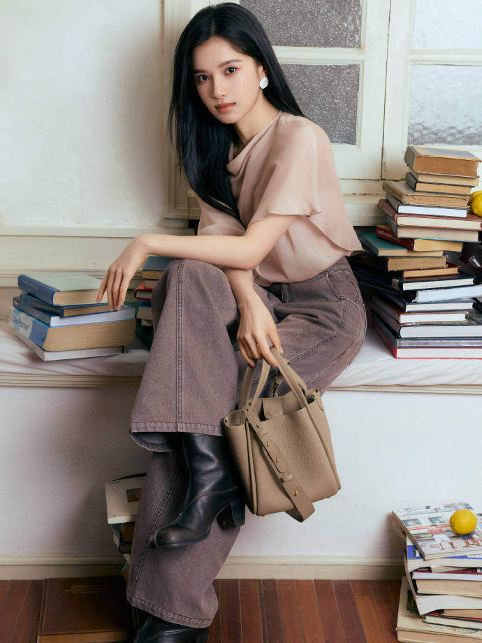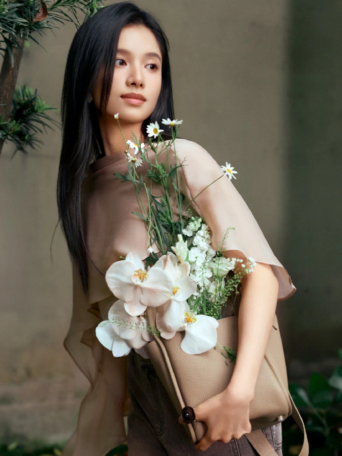 那只出镜率极高的浅棕色托特包,更是整组造型的点睛之笔。它可以安安静静地放在身侧的书堆旁,也可以被她轻握在手里,装下一整包的春日繁花。像极了文艺女生日常里最离不开的那只包,装得下书本与梦想,也装得下鲜花与细碎的日常。