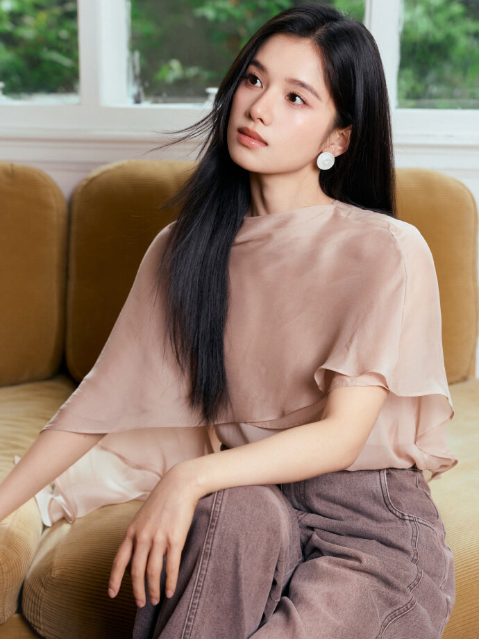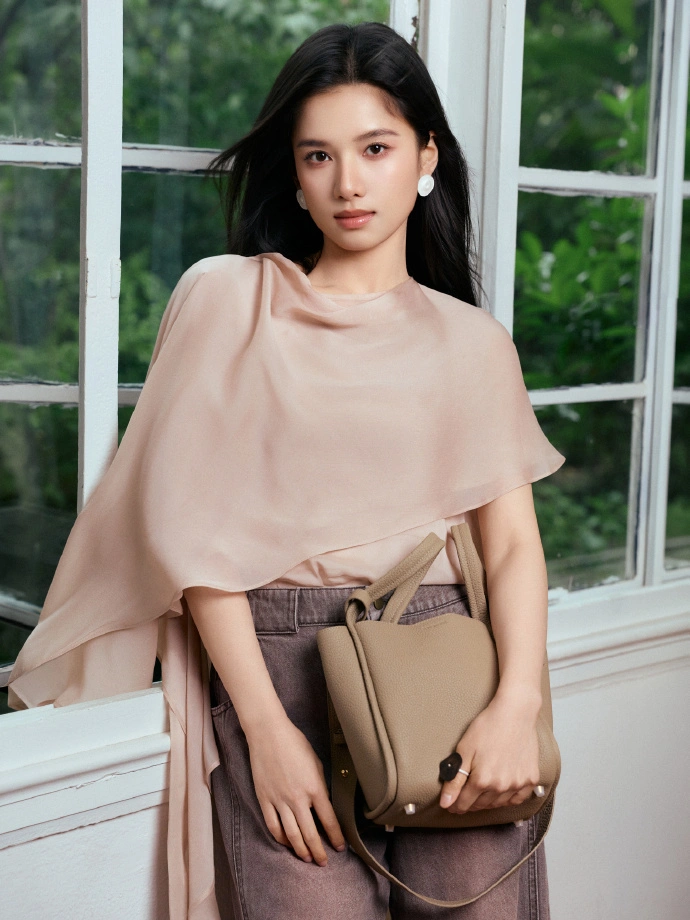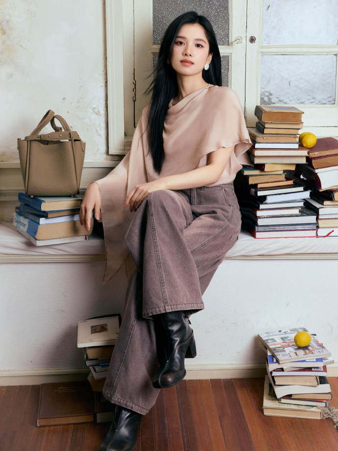 穿搭上,这组造型也完美踩中了松弛感穿搭的精髓,没有繁复的设计,却处处都是恰到好处的心思。一件裸色的飘逸披肩款上衣,自带一层温柔的柔光滤镜,轻薄的面料随着动作轻轻晃动,把女性的柔婉气质衬得刚刚好;下身搭配一条水洗灰的阔腿牛仔裤,中和了上衣的柔,添了几分随性与自在;脚上一双黑色粗跟短靴,又给整体造型加了几分笃定的力量感,柔而不弱,松弛却不松散。