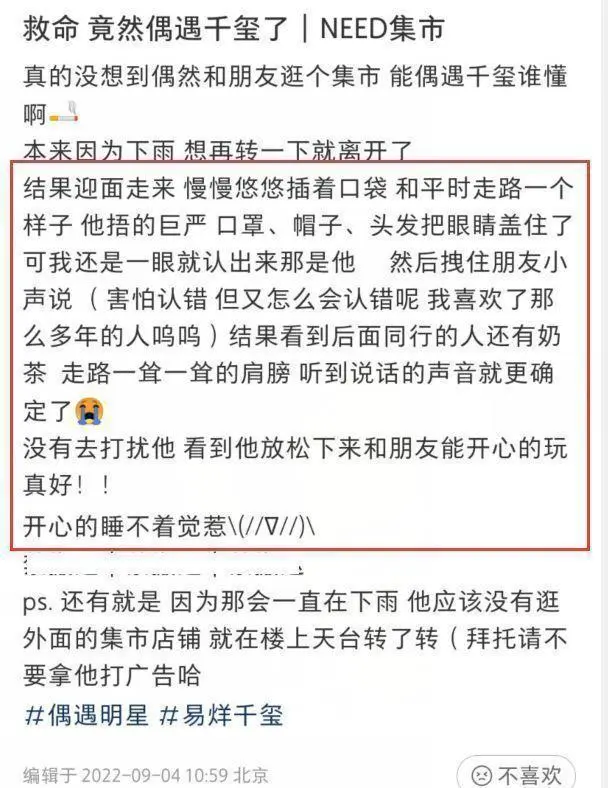 易烊千玺逛集市被偶遇 穿着黑色帽衫拍照打扮休闲低调 全文约69字, 阅读需要1分钟 4日,有网友称在逛集市时偶遇易烊千玺。当天,易烊千玺身穿黑色卫衣,搭配迷彩裤,脚踩高帮鞋,戴着口罩,整个人打扮得相当低调。期间,易烊千玺不断拍照等,还和友人聊天。 4日,有网友称在逛集市时偶遇易烊千玺。当天,易烊千玺身穿黑色卫衣,搭配迷彩裤,脚踩高帮鞋,戴着口罩,整个人打扮得相当低调。期间,易烊千玺不断拍照等,还和友人聊天。 相关人物
