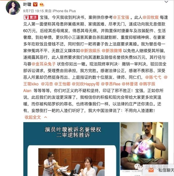 叶璇倒也是好心,自己胜诉后,还将此事举一反三的告知了好友王宝强,并把其和“马荣事件”联合起来称:供王宝强参考。