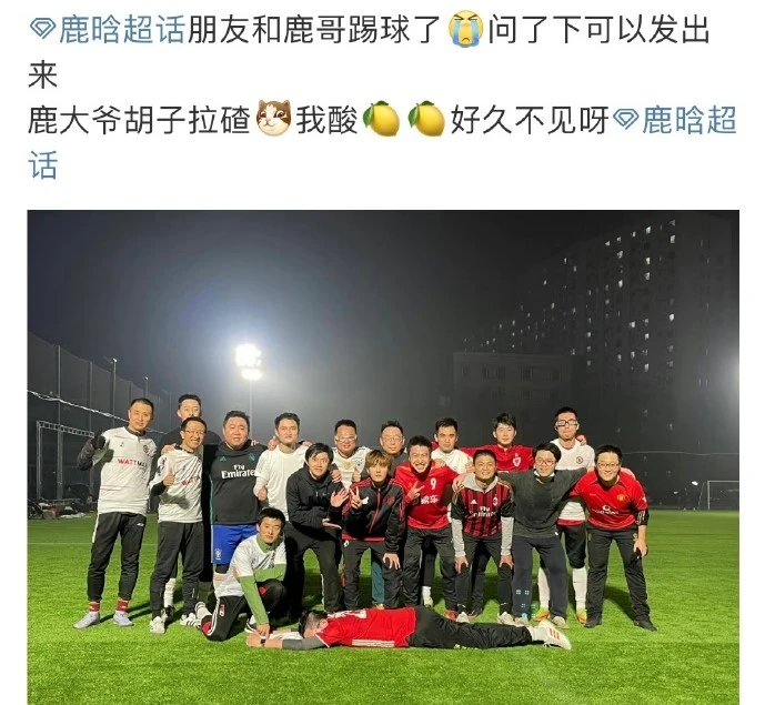 鹿晗现身踢球大合照中 穿运动服比耶状态舒适自然 全文约45字, 阅读需要1分钟 近日,有网友晒出鹿晗与朋友踢球的大合照,鹿晗穿运动服比耶看起来舒适自然,胡子微显被网友调侃“鹿大爷”。 近日,有网友晒出鹿晗与朋友踢球的大合照,鹿晗穿运动服比耶看起来舒适自然,胡子微显被网友调侃“鹿大爷”。 相关人物