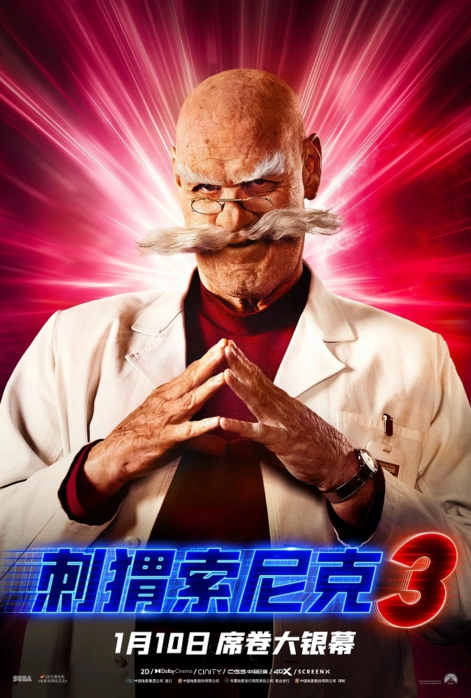 由美国派拉蒙影片公司出品的电影《刺猬索尼克3》发布”全家开笑“预告及“电力十足”全角色海报,索尼克小队遇上全新劲敌夏特,终极大战一触即发!更有搞笑大师金·凯瑞一人分饰蛋头博士祖孙俩,双倍坏蛋双倍快乐!以及前两部带给大家无数欢乐与美好记忆的原班人马这一次也悉数回归,笑点升级一口气看过瘾!1月10日,带给你前所未有的欢乐燃爽体验,来电影院和家人朋友一起新年笑不能停!