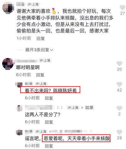 网友偶遇陈晓陈妍希做核酸 二人同穿运动装秀恩爱 全文约103字, 阅读需要1分钟 近日,有网友在个人社交平台分享出在做核酸现场偶遇陈晓陈妍希,夫妻二人同穿一身运动装,装扮简单舒适又随性。大白在评论区发言表示偶遇陈晓陈妍希。陈妍希头扎高马尾戴着遮阳帽,穿一身运动风装扮简单又舒适。 近日,有网友在个人社交平台分享出在做核酸现场偶遇陈晓陈妍希,夫妻二人同穿一身运动装,装扮简单舒适又随性。大白在评论区发言表示偶遇陈晓陈妍希。陈晓穿一身运动装随性低调。陈妍希头扎高马尾戴着遮阳帽,穿一身运动风装扮简单又舒适。 相关人物