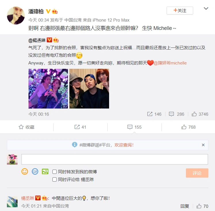 5月31日是陈妍希生日,杨丞琳凌晨晒出与自己与陈妍希、潘玮柏的合照为陈妍希庆生,随后潘玮柏转发杨丞琳微博,借其晒出的合照为陈妍希庆生,并调侃杨丞琳“最右边那个路人没事进来合照干嘛?”