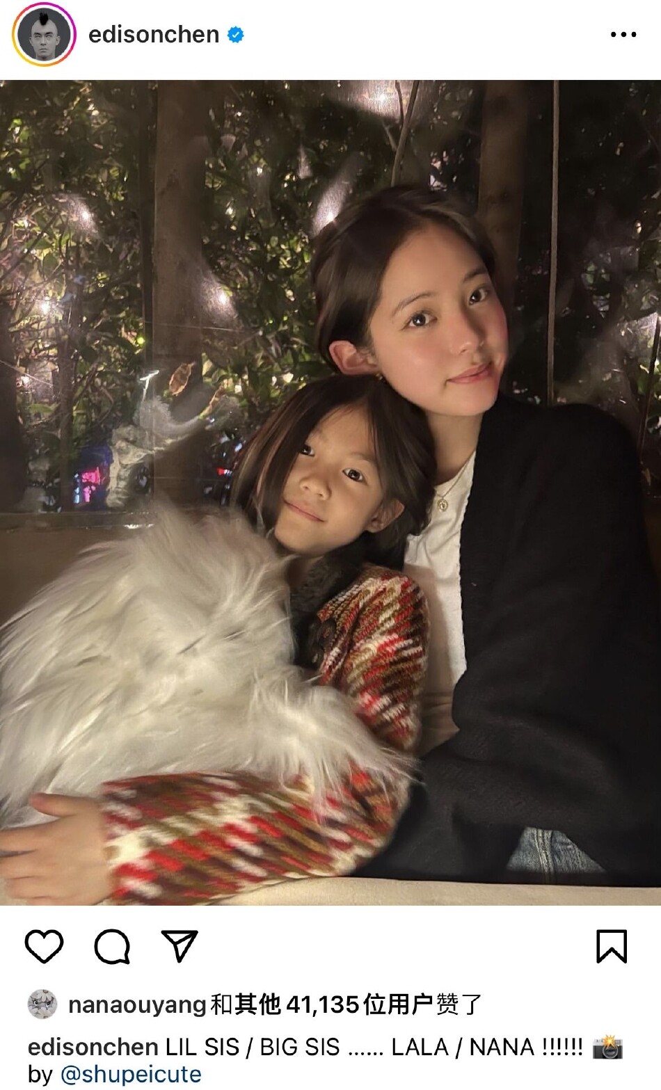 欧阳娜娜与陈冠希女儿合照 两人相互依偎笑容甜美 全文约50字, 阅读需要1分钟 12日,陈冠希在社交媒体平台晒出欧阳娜娜与自己女儿的合照。照片中欧阳娜娜与陈冠希女儿相互依偎,笑容甜美,十分亲密。 12日,陈冠希在社交媒体平台晒出欧阳娜娜与自己女儿的合照。照片中欧阳娜娜与陈冠希女儿相互依偎,笑容甜美,十分亲密。 相关人物