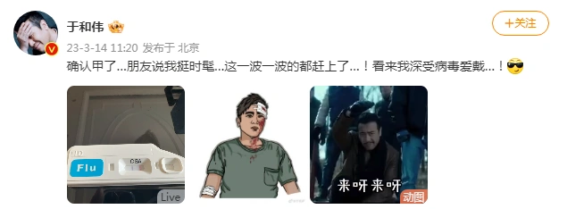 于和伟发文称得甲流 调侃自己抵抗病毒方面“赶时髦” 全文约22字, 阅读需要1分钟 于和伟发文称自己得了甲流,调侃自己“很赶时髦”。 3月14日。于和伟发文称自己得了甲流,调侃自己“很赶时髦”。 相关人物