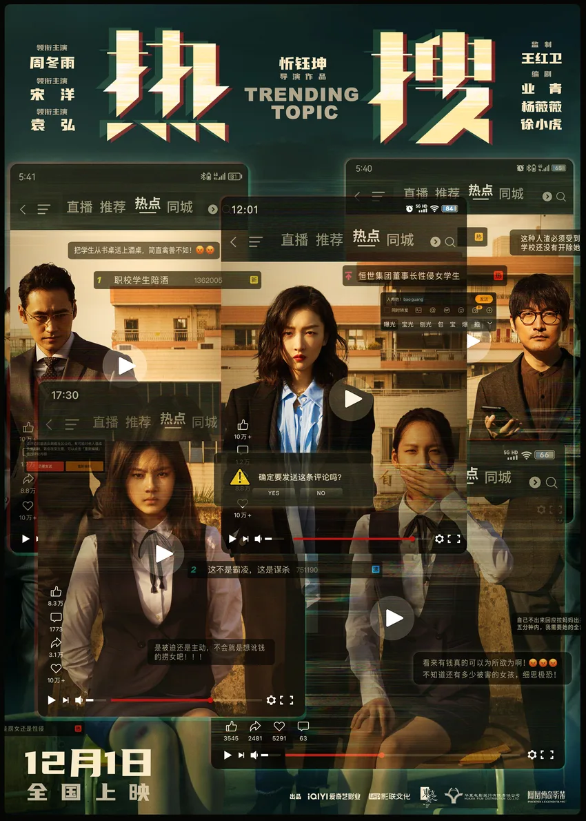 今日,由忻钰坤执导,王红卫监制,周冬雨、宋洋、袁弘领衔主演的电影《热搜》发布“富豪饭局”版预告及“按键伤人”海报。预告中,校园霸凌当事人遭网暴后跳楼,却引出了富豪性侵女孩的丑闻。得知真...