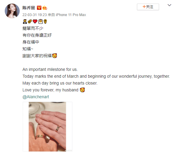 陈乔恩官宣与男友艾伦结婚 陈妍希王心凌等送祝福 全文约33字, 阅读需要1分钟 31日,陈乔恩官宣与男友艾伦结婚,好友陈妍希王心凌颖儿等为其送上了美好祝福。 31日,陈乔恩官宣与男友艾伦结婚,好友陈妍希王心凌颖儿等为其送上了美好祝福。 相关人物