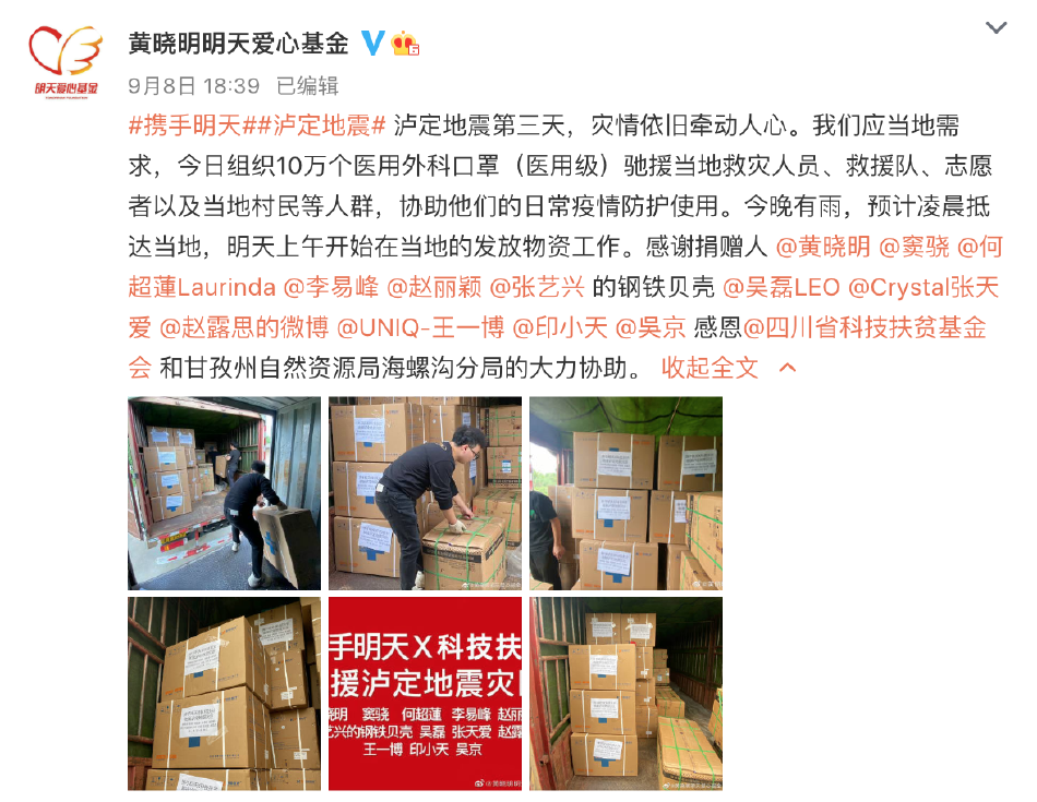 王一博向四川泸定捐赠物资 以驰援灾区救灾人员等 全文约83字, 阅读需要1分钟 8日,黄晓明明天爱心基金官微发文称王一博向四川泸定捐赠物资,其中包括医用外科口罩(医用级)。目前,这批物资已驰援当地救灾人员、救援队、志愿者以及当地村民等人群,协助他们的日常疫情防护使用。 8日,黄晓明明天爱心基金官微发文称王一博向四川泸定捐赠物资,其中包括医用外科口罩(医用级)。目前,这批物资已驰援当地救灾人员、救援队、志愿者以及当地村民等人群,协助他们的日常疫情防护使用。 相关人物