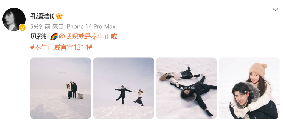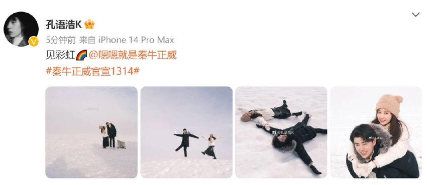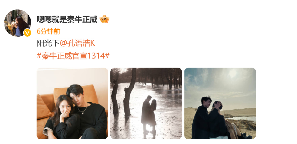 秦牛正威孔语浩官宣恋情 晒情侣恩爱写真太般配 全文约38字, 阅读需要1分钟 2月17日,秦牛正威、孔语浩官宣恋情,两人同时晒出情侣写真,配文“阳光下,见彩虹”默契恩爱太般配。 2月17日,秦牛正威、孔语浩官宣恋情,两人同时晒出情侣写真,配文“阳光下,见彩虹”默契恩爱太般配。 相关人物