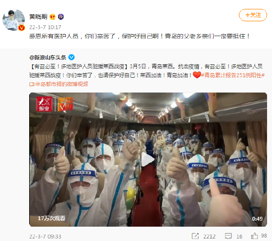 近日,山东青岛莱西发现疫情,3月5日多地医护人员驰援莱西战疫!作为一个青岛人,黄晓明3月7日也是转发了相关微博,为家乡加油:“感恩所有医护人员,你们辛苦了,保护好自己啊!青岛的父老乡亲们一定要挺住!”