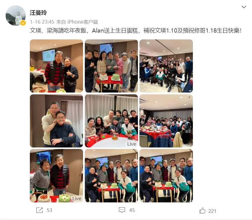 胡枫91岁大寿众星云集好热闹 修哥身材挺拔精神状态好 全文约55字, 阅读需要1分钟 1月16日,汪曼玲晒出一组聚会照,并配文称:文瑛、梁海请吃年夜饭,Alan送上生日蛋糕,补祝文瑛1.10及预祝修哥1.18生日快乐。照片中,众星云集,热闹非凡。 1月16日,汪曼玲晒出一组聚会照,并配文称:文瑛、梁海请吃年夜饭,Alan送上生日蛋糕,补祝文瑛1.10及预祝修哥1.18生日快乐。照片中,众星云集,热闹非凡。 相关人物