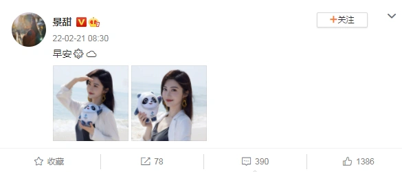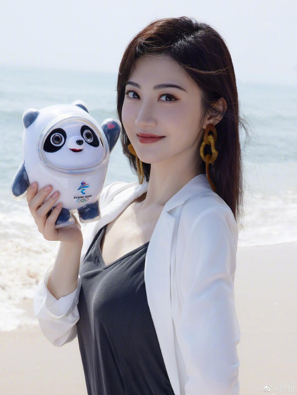 21日,景甜晒出一组美照,画面中她站在海边,手捧冰墩墩,又美又可爱。