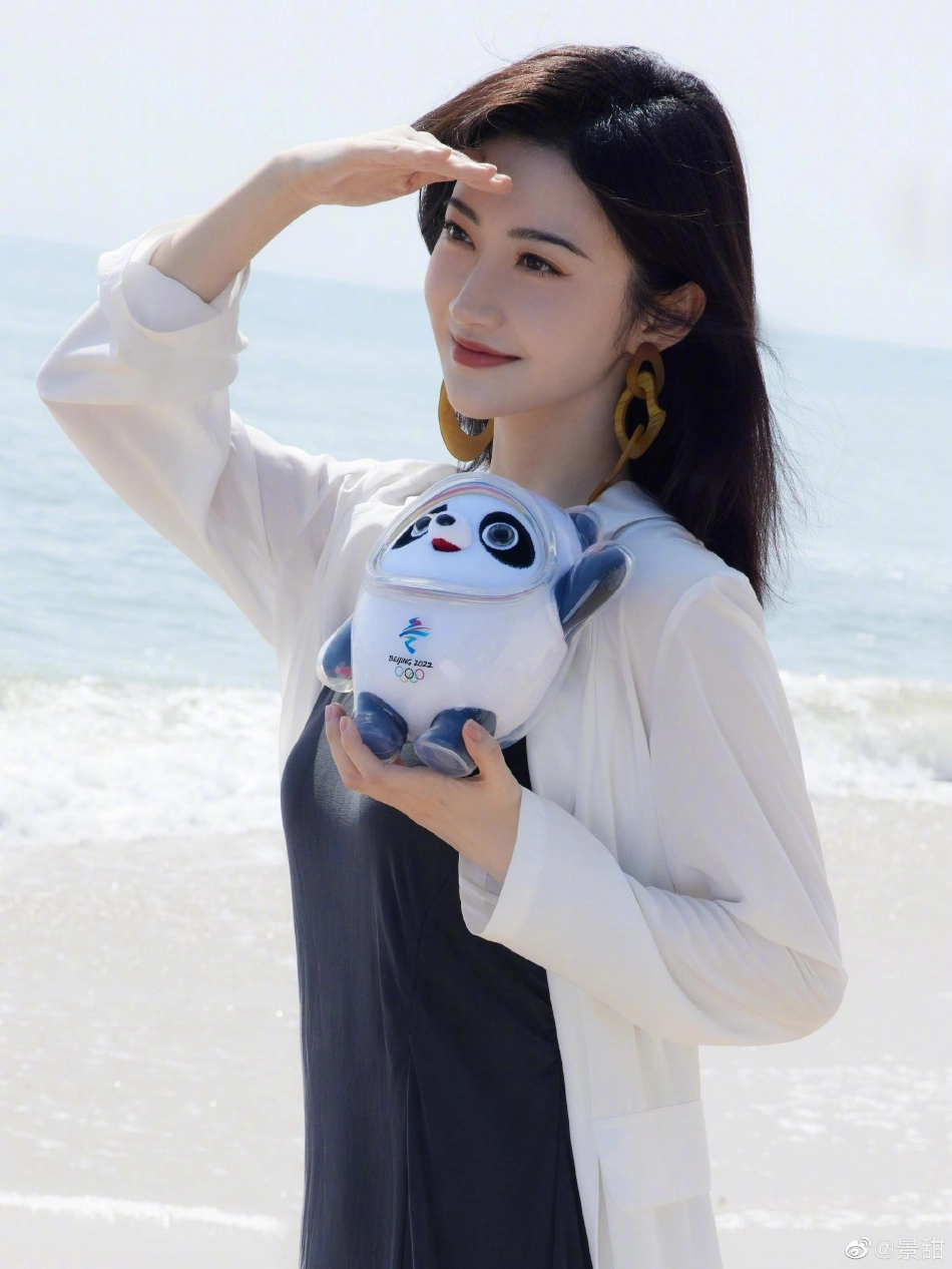 景甜海边捧冰墩墩拍照又美又可爱