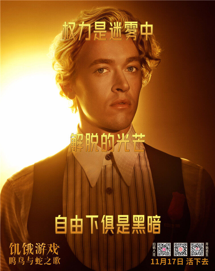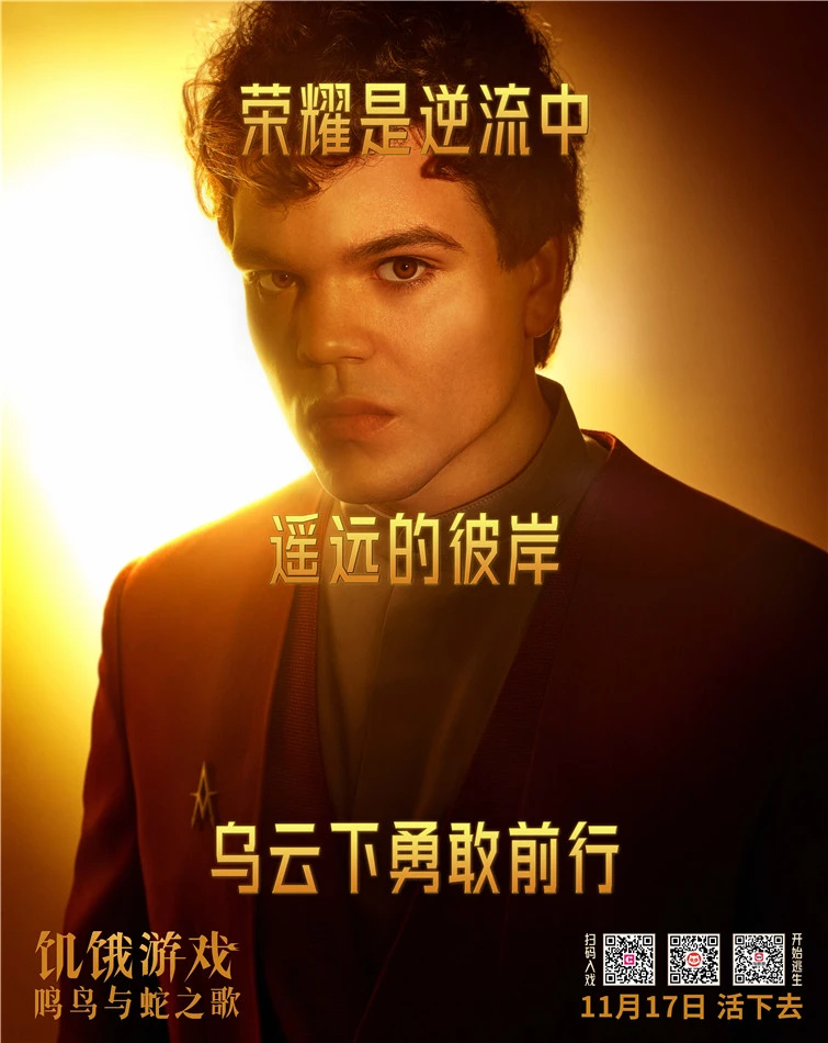 由美国狮门影片公司出品,中国电影集团公司进口,中国电影股份有限公司发行、译制的电影《饥饿游戏:鸣鸟与蛇之歌》于11月14日举办“大戏开局·夺命速逃”中国首映礼,分别在北京与南京两地与影迷朋友们提前见面!活动现场惊喜不断,不仅有“奇迹战歌”循环播放,带人一秒入戏;更有主演汤姆·布莱斯和导演弗朗西斯·劳伦斯二人的问候视频高能播出,给现场观众增添了更具仪式感与代入感的观影乐趣!此外,影片今日还释出了一组“恶魔诞生”主题海报,膨胀的权力步步引诱,导师与贡品将走向何种结局?影片将于11月17日以4K/IMAX/CINITY/CGS中国巨幕/4DX/DTSX版本全球同步上映,逃杀待启,谁能存活!