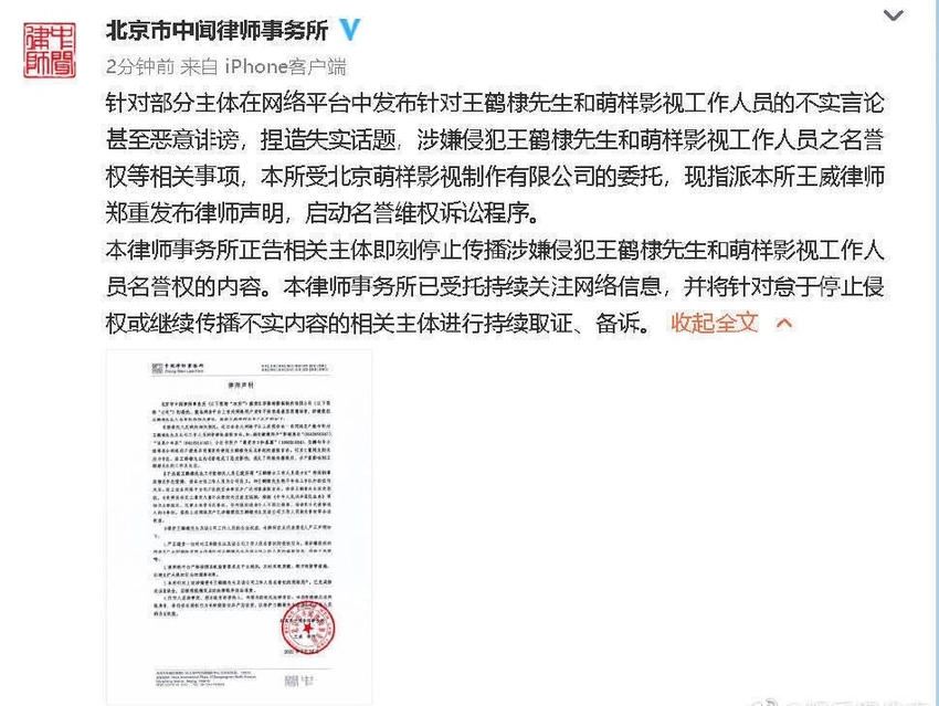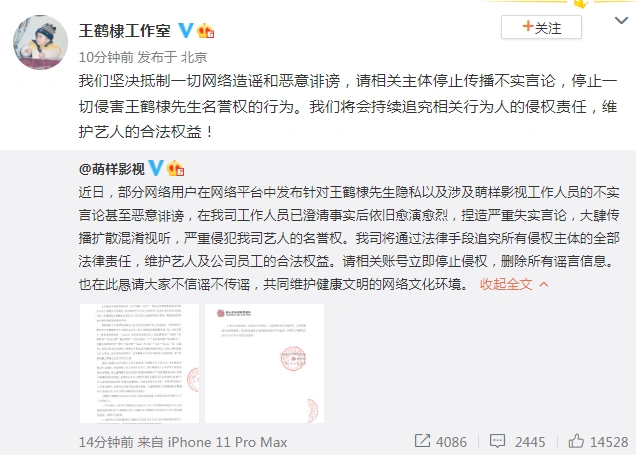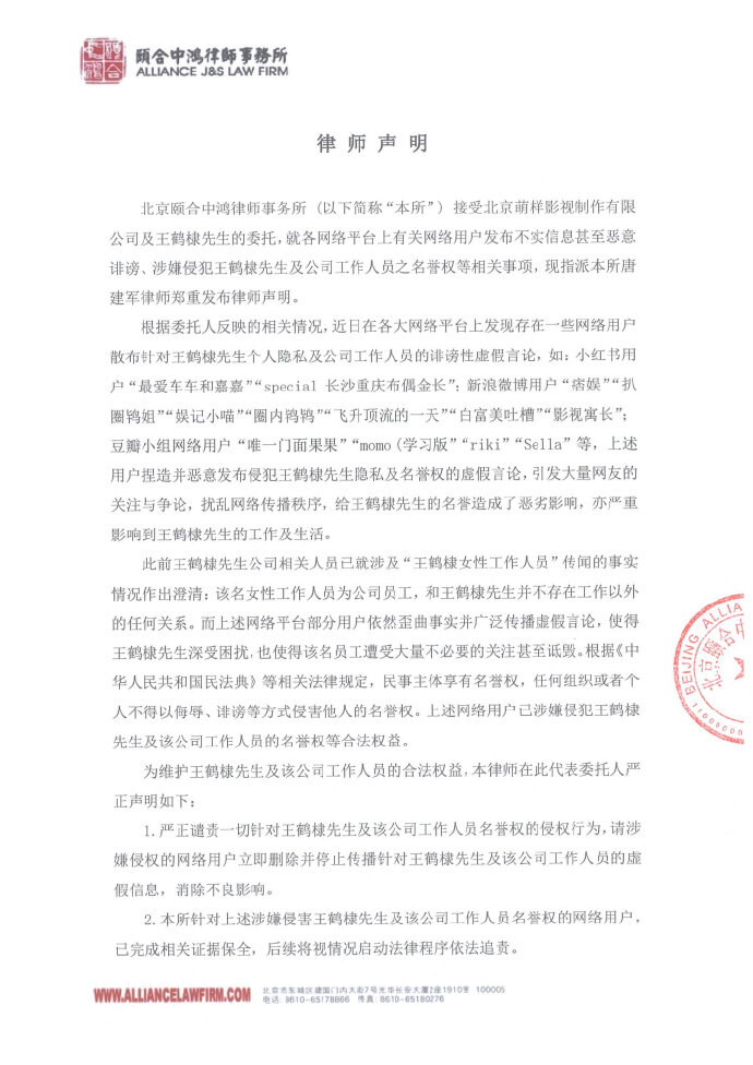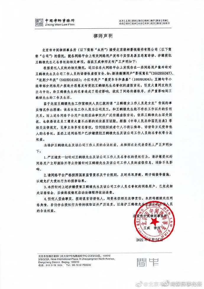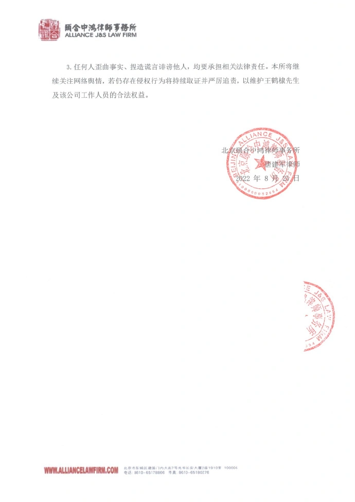 8月24日,王鹤棣方发在公共平台委托某律师事务所发布律师声明,再次否认工作人员是王鹤棣女友。并表示已完成相关证据保全,后续将视情况启动法律程序依法追责。25日,萌样影视发出律师声明,再次强调网传内容为不实言论。随后,王鹤棣工作室转发表示:“坚决抵制一切网络造谣和恶意诽谤。”