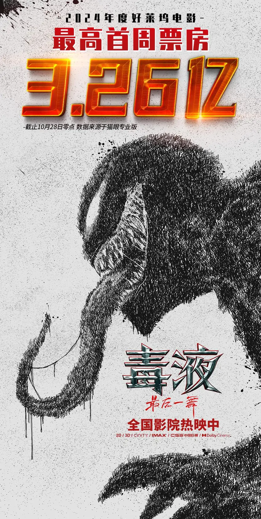 《毒液:最后一舞》10月23上映首日,便斩获6600万人民币的票房佳绩,刷新了自2019年暑期以来漫威电影首日票房纪录。随后更连续五日蝉联票房及观影人次日冠,创下2024年度好莱坞电影最高首周票房成绩!截止10月28日零点,影片全国票房已突破3.26亿人民币,全方位证实“毒液”顶流IP的魅力。