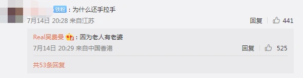 吴费曼晒爸妈牵手照 调侃吴镇宇“老人有老婆” 全文约53字, 阅读需要1分钟 7月14日,吴费曼晒出一组与爸妈游玩的照片,吴镇宇和老婆背影出镜。有网友在评论留言:“为什么还手拉手”,费曼回复:“因为老人有老婆”。 7月14日,吴费曼晒出一组与爸妈游玩的照片,吴镇宇和老婆背影出镜。有网友在评论留言:“为什么还手拉手”,费曼回复:“因为老人有老婆”。 相关人物