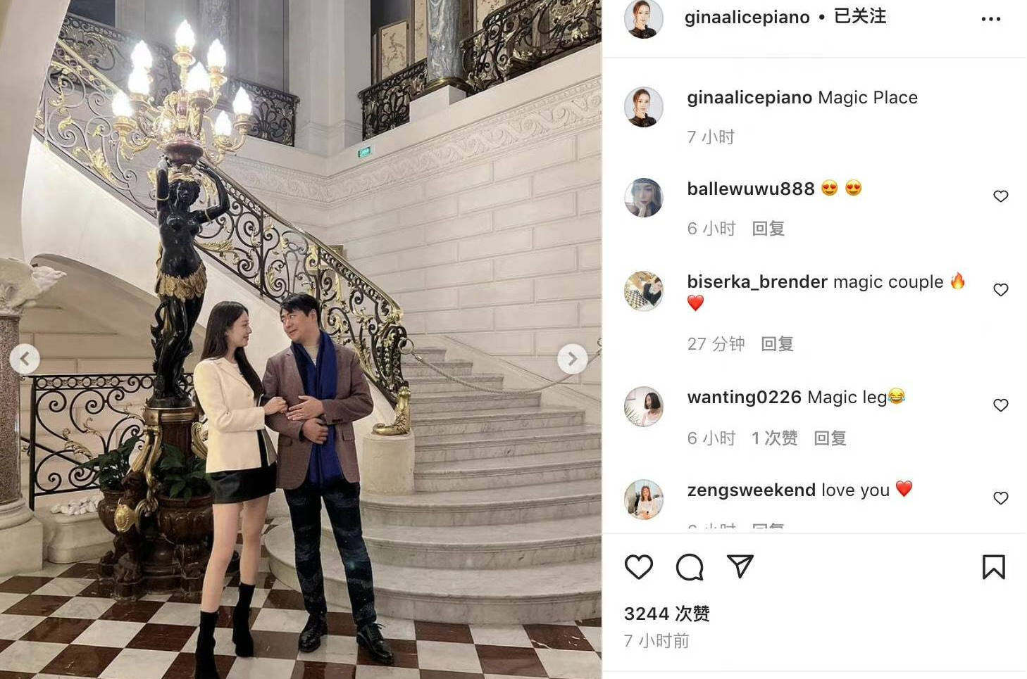 吉娜晒与郎朗甜蜜合影 夫妻俩深情对视氛围超甜 全文约53字, 阅读需要1分钟 11日,吉娜在社交平台分享了和丈夫郎朗的合影,并配文“Magic Place”,意为“真是一个神奇的地方”。照片中,吉娜双腿纤细笔直,和郎朗对视十分甜蜜。 11日,吉娜在社交平台分享了和丈夫郎朗的合影,并配文“Magic Place”,意为“真是一个神奇的地方”。照片中,吉娜双腿纤细笔直,和郎朗对视十分甜蜜。 相关人物
