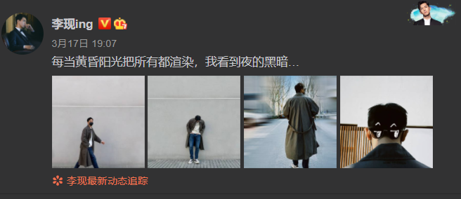 李现晒男友风私服帅照 牛仔裤配军绿色风衣随性苏感满满 全文约38字, 阅读需要1分钟 17日,李现晒出一组私服帅照,并配文“每当黄昏阳光把所有都渲染,我看到夜的黑暗… ”,又被帅到了。 17日,李现晒出一组私服帅照,并配文“每当黄昏阳光把所有都渲染,我看到夜的黑暗… ”,又被帅到了。 相关人物